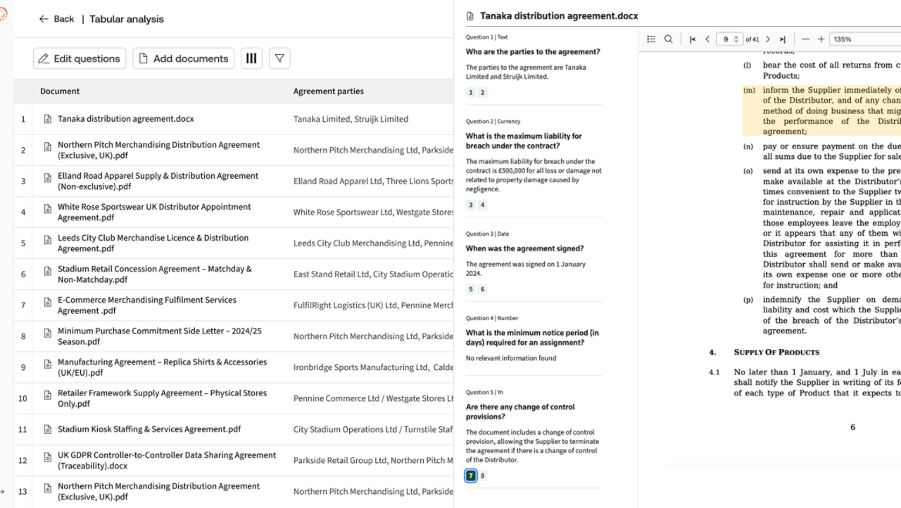 Quickly comprehend information within long, complex documents. Ask in-depth questions and receive substantive analysis – complete with citations – plus assess similarities, differences, and favourability between them.
