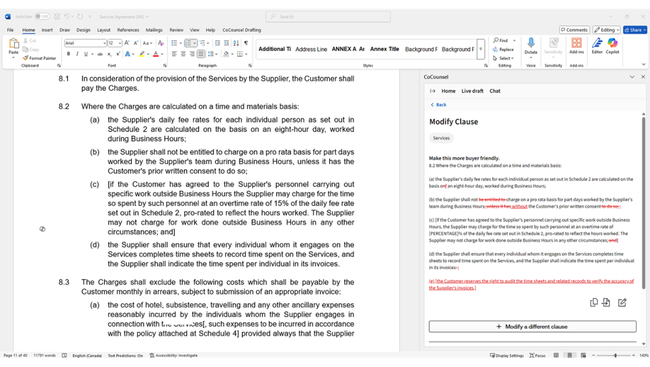 Use AI to instantly generate or refine clause language within drafts. Simply describe your needs in natural language, and CoCounsel delivers high-quality clauses tailored to your specific requirements.