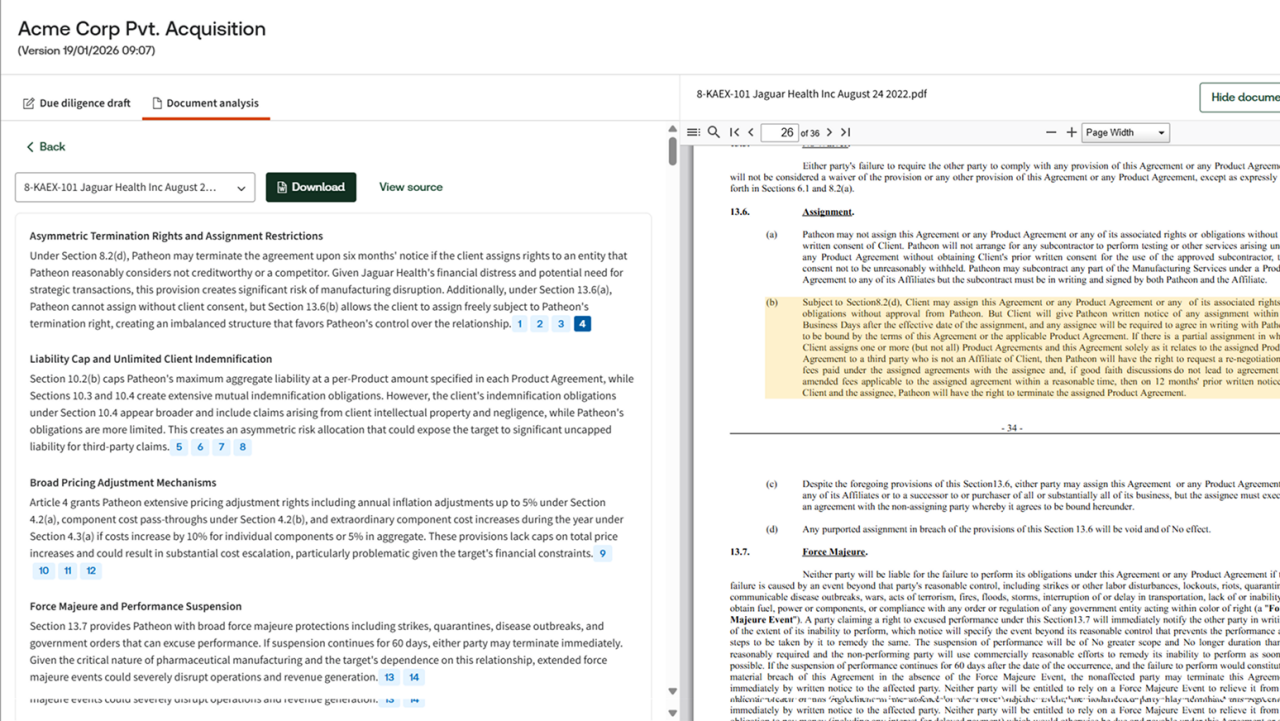 Leverage HighQ’s due diligence guided workflow, powered by CoCounsel and informed by Practical Law expertise, to automate document intake from virtual data rooms, surface key risks, perform deep document analysis, and generate structured, shareable, and tabulated reports. Do it all within one secure, centralised platform for faster, quality, and more consistent deal outcomes.