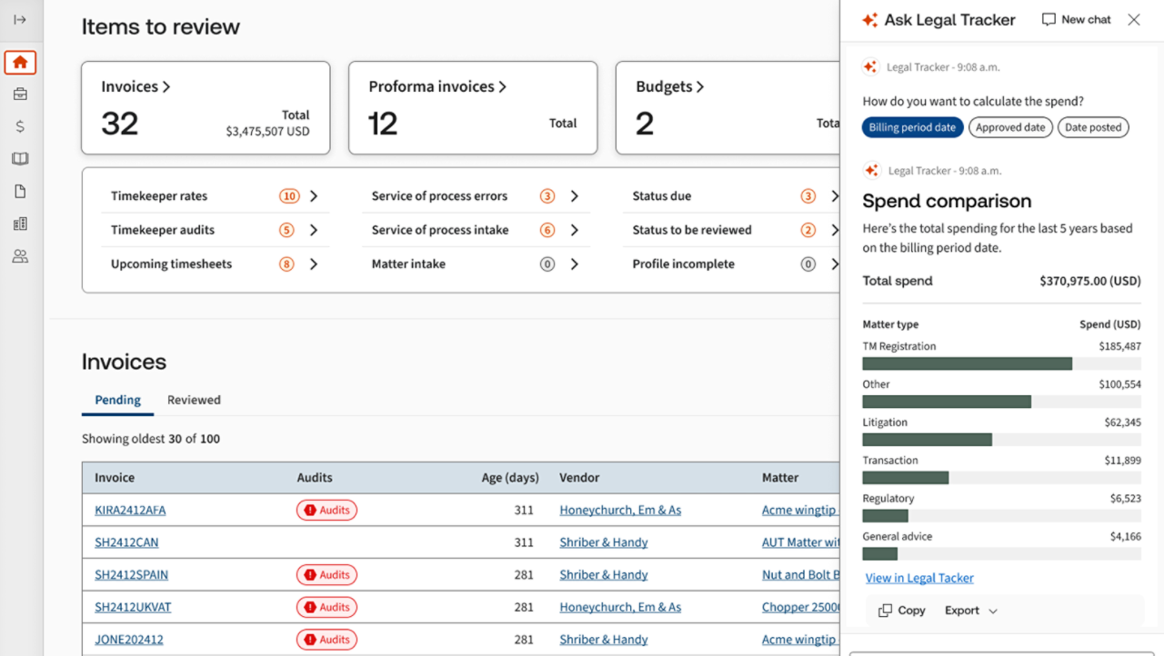 Get answers faster by asking plain-language questions. Review, measure, and forecast spend, and demonstrate your legal department's value with AI‑driven insights and industry‑leading benchmarking tools.