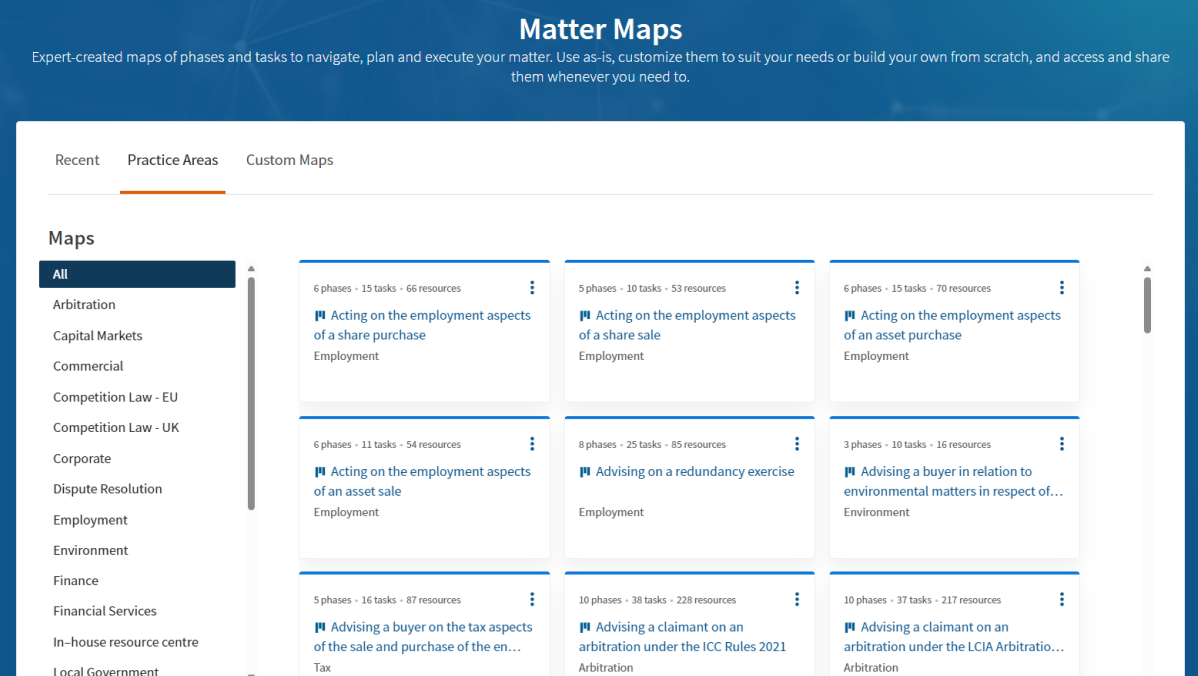Access a visual step-by-step process for tasks on a variety of legal matters with editorially curated links to relevant resources. This interactive feature allows you to customize any Matter Maps to help you find the right Practical Law content for the task at hand.