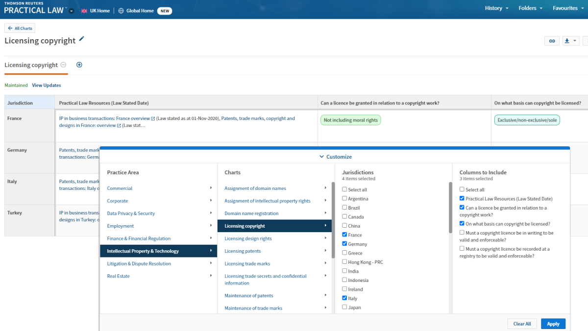 Create custom charts with just a few clicks that compare answers to key questions across multiple jurisdictions, helping to identify local laws faster.