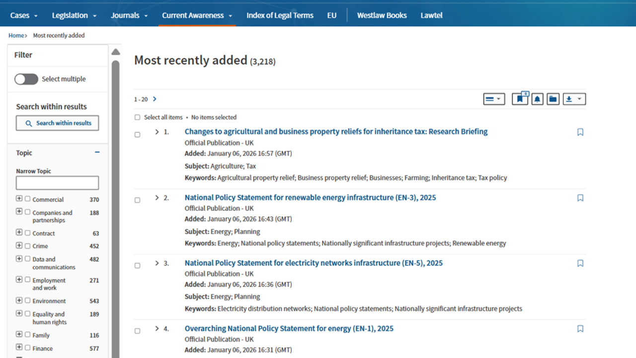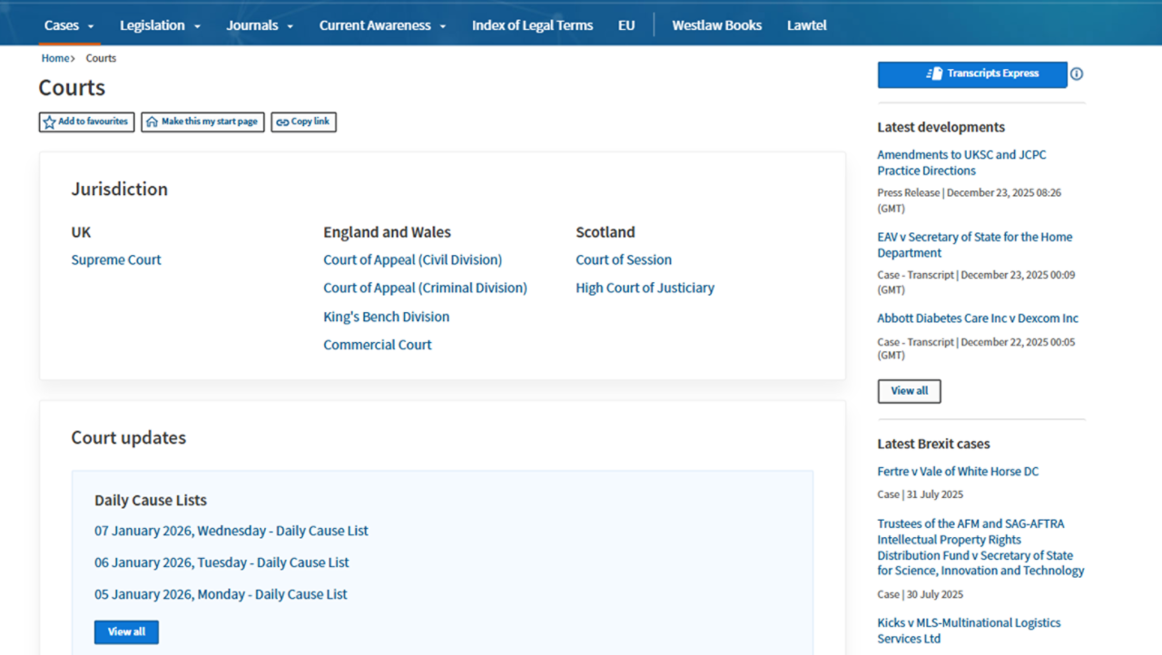 Westlaw Edge UK offers a comprehensive collection of primary law, including case law, dockets, legislation, drafts, legal journals, current awareness alerts, and EU legal materials.