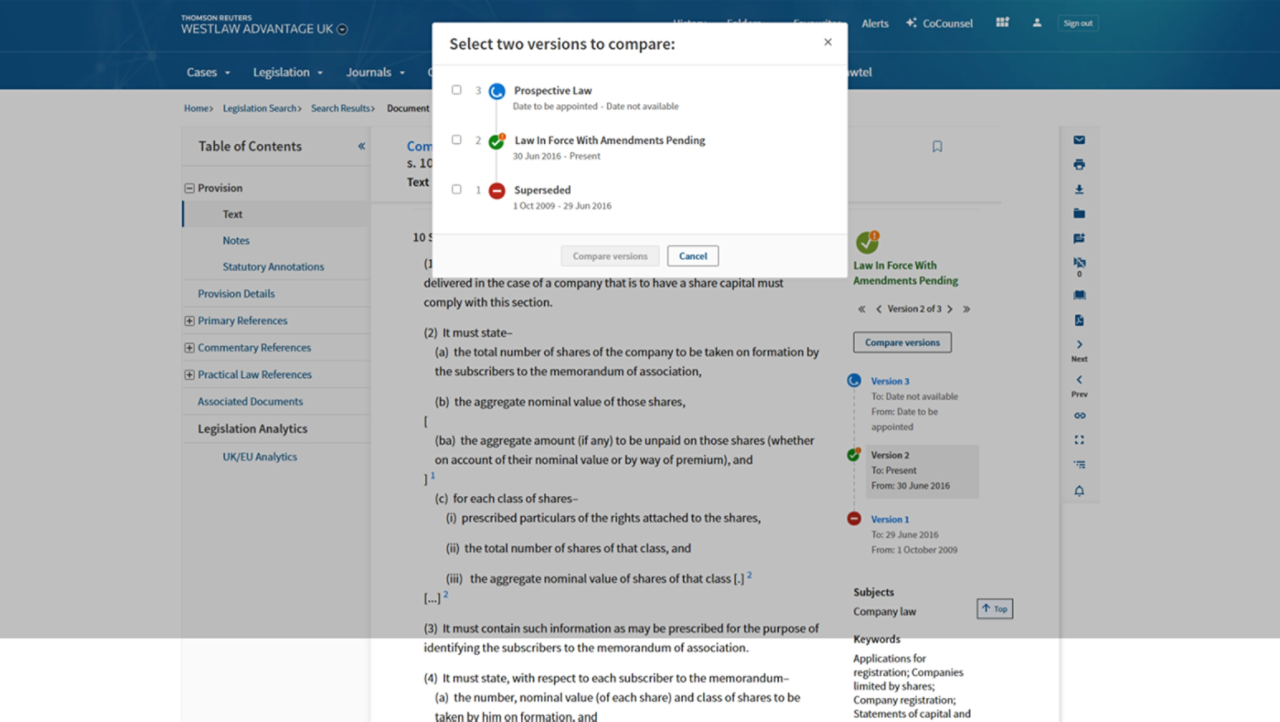 Quickly understand how the law will affect you, your organisation, and the industry at different points in time. Compare the changes across any two versions of legislation in the UK's English, Welsh, Northern Irish, and Scottish jurisdictions.