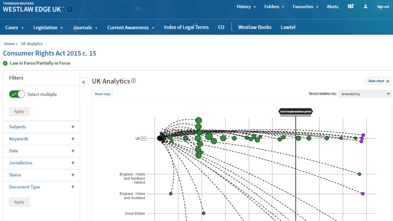 Uncover, display, and navigate complex networks by exploring the relationships of any UK legislation at any time. Quickly see the impact of newly published legislation and bills going through Parliament, and draft statutory instruments by viewing which UK legislation they amend, helping you uncover areas you might have otherwise missed and complete your research in record time.