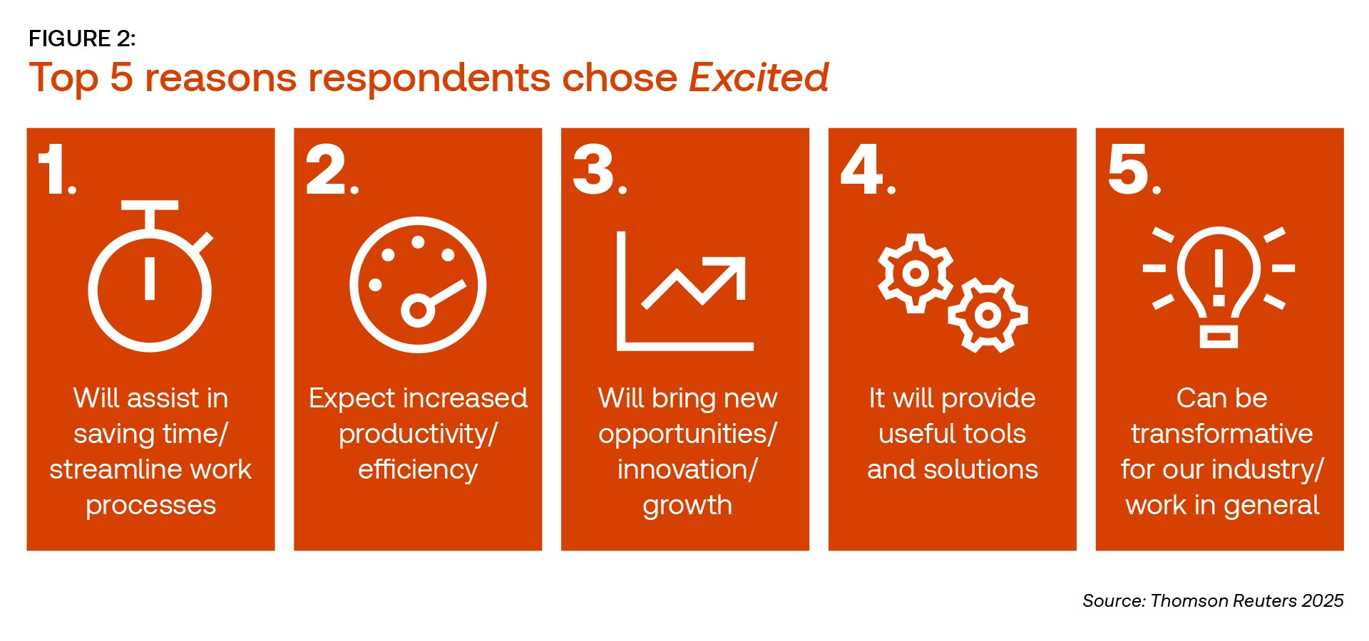 Reducing time-consuming, repetitive grunt work also lets lawyers achieve a greater work-life balance and reduces the potential of burnout, particularly for junior lawyers. These lawyers often must sacrifice a weekend to pore through case histories and search for specific clauses in a great pile of documents. Now AI solutions can do much of that work in minutes. In the most recent Generative AI in Professional Services Report, 55% of respondents said they were excited or hopeful about AI technology. This represents a combined increase of 11% when compared to 2024. Respondents cited time savings, streamlined work processes, increased productivity and efficiency, and new opportunities for innovation and growth as the top reasons for being excited.